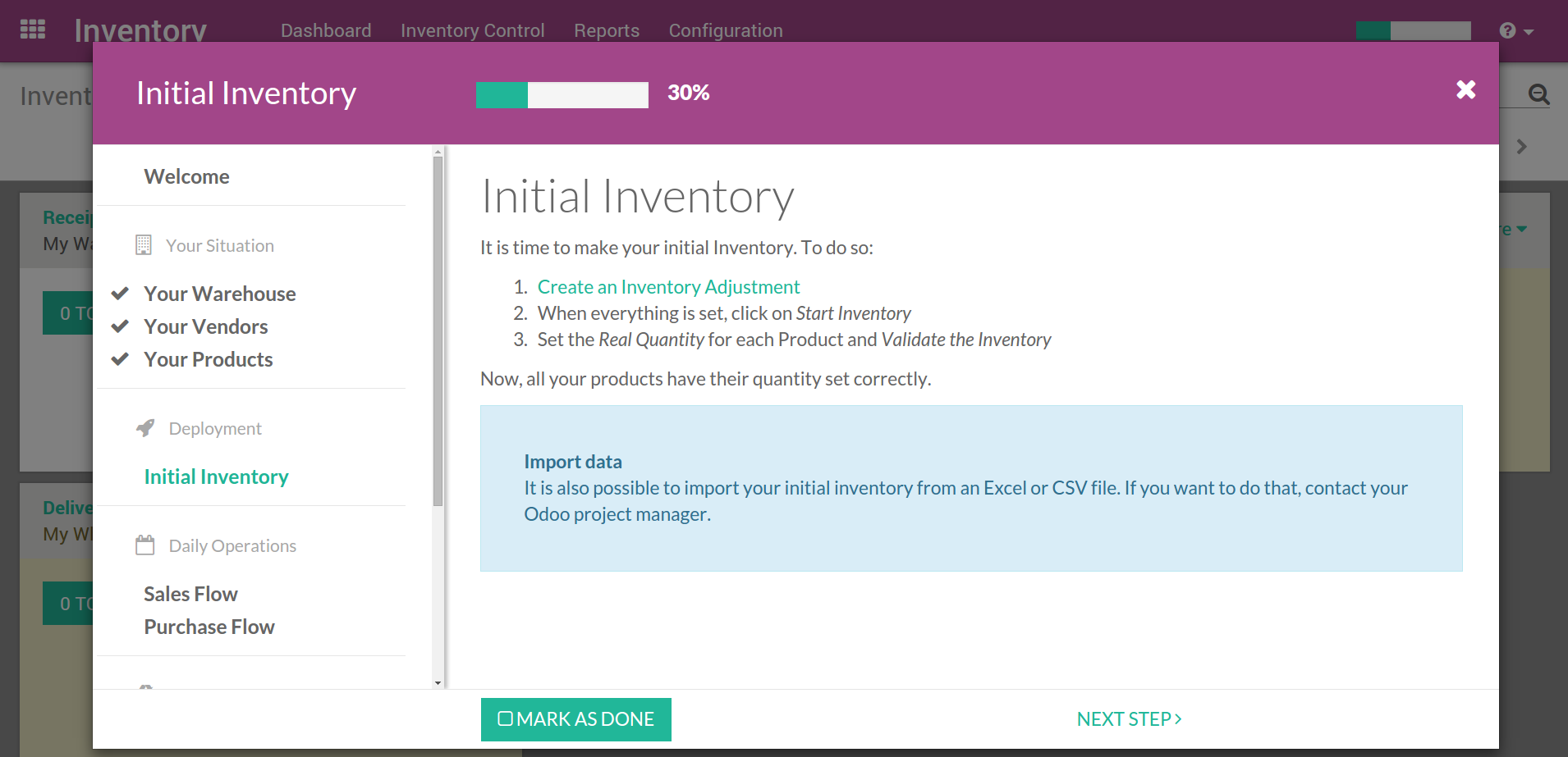 Odoo的库存应用有一个实施向导, 你可以参照者对系统进行配置。